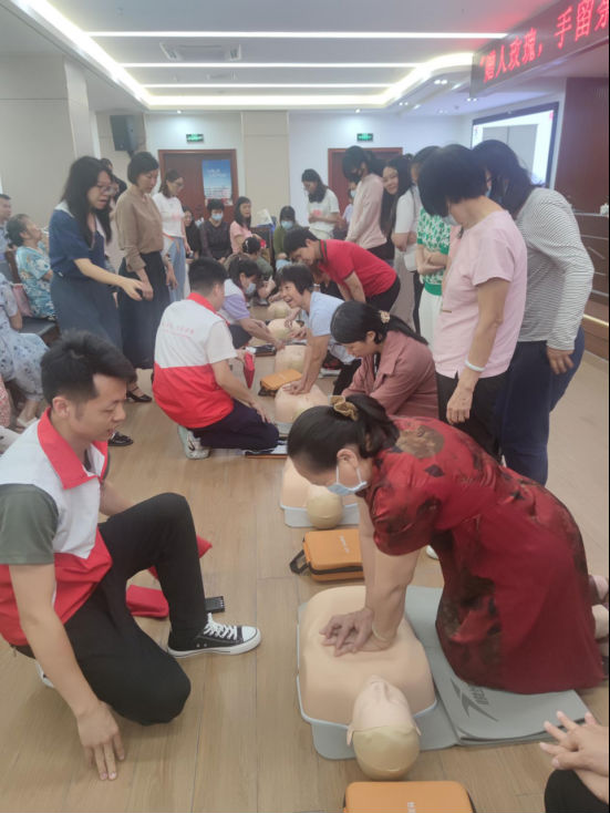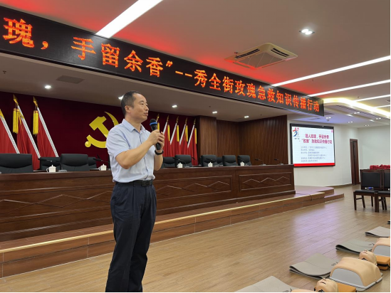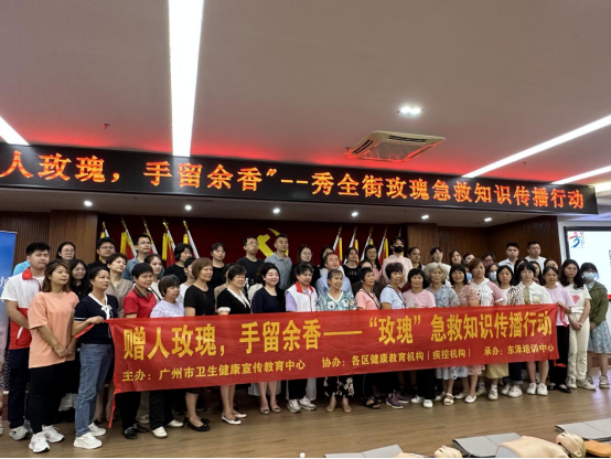 5月29日上午,由广州市卫生健康宣传教育中心主办,花都区卫生健康局、花都区健康教育所协办,东泽安全培训中心承办的“赠人玫瑰,手留余香”——“玫瑰”急救知识传播行动在花都区秀全街道便民服务中心举行,共有50多位社区居民积极参与活动。