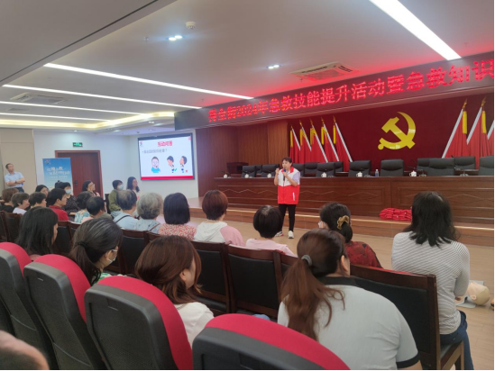 培训进入理论讲解环节,广州市红十字会主任护师潘教授对心肺复苏、AED电击除颤的重要性进行讲解说明,一边现场示范讲解急救技能的正确流程和操作要点,一边针对性地解答如何应对日常生活中的突发情况,确保在场人员都能熟练掌握。